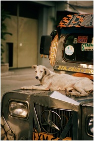 A laid-back dog rests on the hood of a classic jee