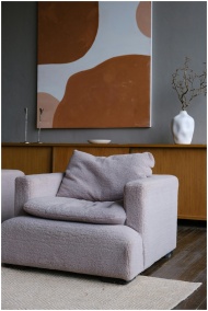 A contemporary interior featuring a plush armchair, wooden furniture, and abstract painting.