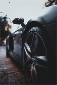 Close-up shot of a sleek, modern luxury sports car wheel with focus on design and details.