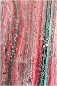 Vibrant abstract fluid art featuring pink and blue hues with a bubble-like texture.