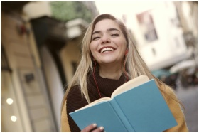 Smiling woman enjoying a book with earbuds in an u