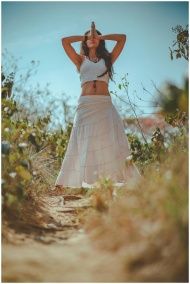 Young woman meditating in a peaceful outdoor setting wearing a white skirt.