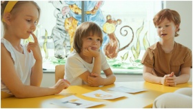 Three children sitting at a yellow table in a classroom, engaging in a learning activity.