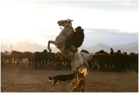 A cowboy rides a rearing horse at sunset, surrounded by a herd of horses and dogs.