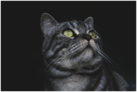 An adorable grey tabby cat with striking green eye