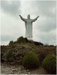 Majestic Christ the King statue rising above lush greenery in Poland.