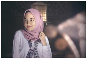 A serene portrait of a woman wearing a pink hijab,