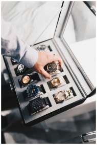 A sophisticated display of luxury watches in an elegant case with a hand selecting one.