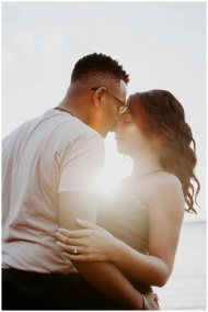 A couple embraces on a beach at sunset, capturing a moment of romance and affection.