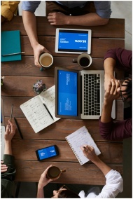 Group of coworkers discussing business strategies with laptops and tablets in a modern office setting.