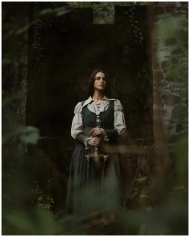 A contemplative woman in a medieval-style dress po