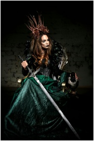 A dramatic and enchanting portrait of a woman in a fantasy witch costume holding a sword.