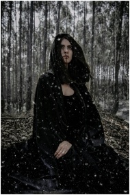A mysterious woman sits in a snowy winter forest, dressed in a dark cloak.