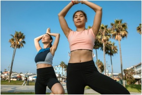 Two women practicing yoga poses outdoors, focusing on wellness and balance under palm trees.