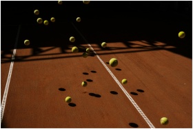 Artistic capture of tennis balls in motion casting dramatic shadows on a clay court surface.
