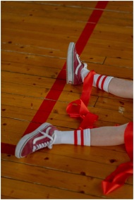 Close-up of legs in sneakers and ribbons on a gym floor, showcasing casual style.