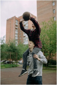 Two brothers enjoying a playful basketball game outdoors in a city playground.