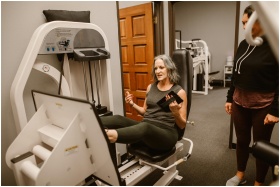 Senior woman working out on a leg press machine with a trainer at a gym.
