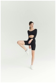 Beautiful woman in activewear balancing in a studio, showcasing fashion and fitness.