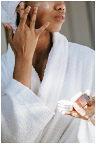Crop unrecognizable young female in white bathrobe applying moisturizing cream on face after shower