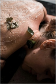 Close-up of a woman enjoying a relaxing spa treatment with natural leaves and exfoliation.