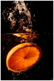 Orange slice creates a splash in water on black ba
