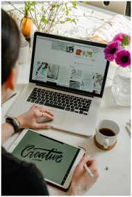 Creative work session featuring a woman using a tablet and laptop for design projects.