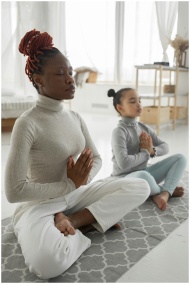 Full body of tranquil young barefooted African American woman in casual clothes sitting on carpet in Padmasana pose with closed eyes while meditating with adorable little daughter at home