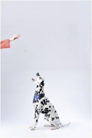 Dalmatian dog catching a treat tossed by a hand in a studio setting, highlighting training.