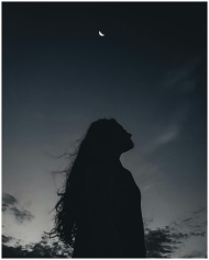 Low angle side view of silhouette of serene long haired female standing alone under night sky with moon