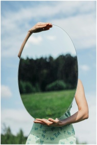 A woman in a floral dress holds an oval mirror reflecting a forest on a sunny day.