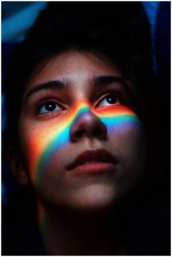 Portrait of a woman with a rainbow light across he