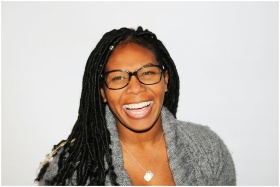 A vibrant portrait of a smiling woman with dreadlocks and glasses, exuding joy.