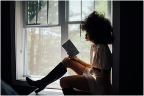 A woman enjoys a peaceful reading session by a win