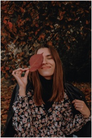 Woman in floral dress smiling with leaf over eye in autumn setting.