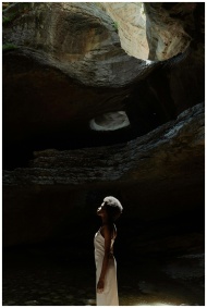 A woman stands thoughtfully inside a cave, illuminated by natural light streaming through the cave opening above her.