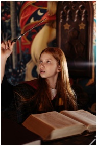 Young girl in costume practicing magic with a wand indoors, surrounded by books.