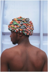 Man wearing a hat made of colorful bottle caps in a unique artistic portrait.