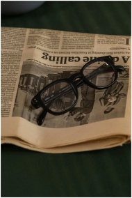 Black rimmed glasses resting on top of a newspaper on a green surface.