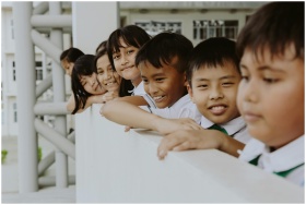A group of smiling children in school uniforms enjoying togetherness outdoors.