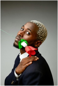 Stylish portrait of a man holding vibrant paper flower, blending art and fashion.