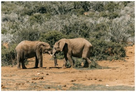 Two African elephants engage playfully in a South African savanna setting, showcasing wildlife interaction.