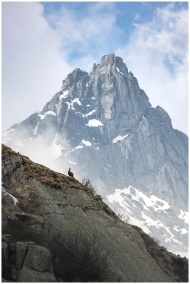 A breathtaking view of a snow-capped mountain peak with a wild goat in the foreground.