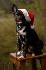 A cute black dog sits on a stool outdoors wearing a festive Santa hat with a leash.