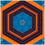 Abstract hexagonal kaleidoscope pattern in blue and orange vibrant shades, perfect for modern art decor.