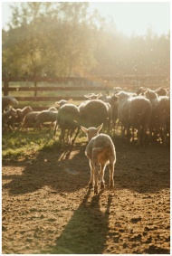 A flock of sheep in a sunlit farmyard during the golden hour, casting long shadows on the ground.