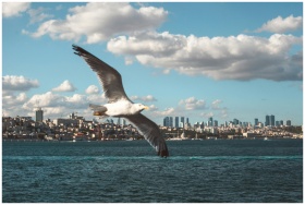 A seagull flying over the Bosphorus, with the Ista