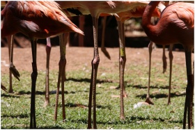 A group of vibrant flamingos with long legs standing on grass in a sunny outdoor setting.