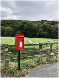 A vibrant red Royal Mail postbox set against a rural Welsh countryside landscape.