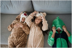 Three kids wearing animal costumes playing together on a sofa, enjoying fun and laughter.